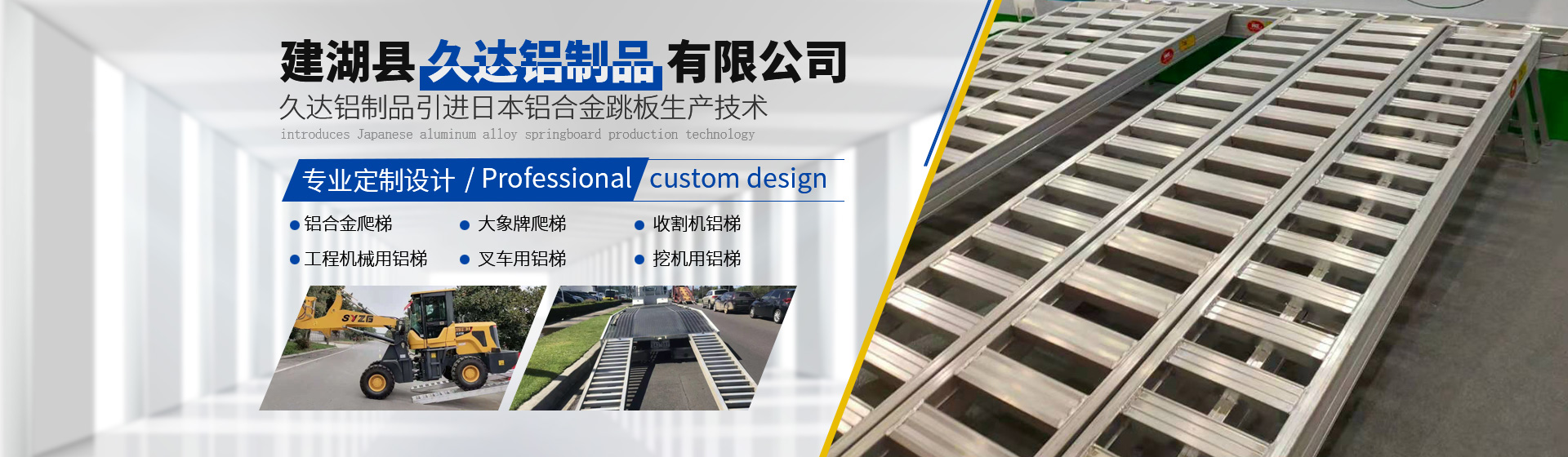建湖縣久達鋁制品有限公司引進日本鋁合金跳板生產(chǎn)技術(shù),專業(yè)生產(chǎn)高強度鋁合金跳板,廣泛應(yīng)用于聯(lián)合收割機、拖拉機、插秧機、挖掘機等機械。 我公司于2012年引進日本全鋁合金跳板生產(chǎn)技術(shù)。經(jīng)過四年的學(xué)習(xí)、探索、生產(chǎn)、銷售,現(xiàn)已全面消化吸收鋁合金跳板技術(shù)、總結(jié)出一套成熟的生產(chǎn)、使用、售后服務(wù)經(jīng)驗;為提高產(chǎn)品質(zhì)量,加大設(shè)備投入,購買歐洲進口的鋁合金焊接設(shè)備和切割設(shè)備,保證產(chǎn)品的焊接強度和精度;結(jié)合中國收割機作業(yè)量大、作業(yè)條件復(fù)雜、中國收割機更重等特點,生產(chǎn)出更適合中國國情的高強度鋁合金跳板,承載力更強,抗疲勞效果更好,使用周期更長,同等使用條件下是市場上仿制產(chǎn)品使用壽命的1.5倍以上。大象牌鋁梯成為中國鋁梯行業(yè)馳名品牌。